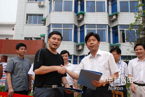 麻城市市長(zhǎng)李開(kāi)壽(右)和什邡市市長(zhǎng)李成金握手。作者 程勝利