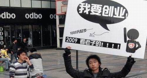 “我要創業,1000元起步……2009,看老子的!”昨(8)日下午4時許,香檳廣場上,一名小伙子擺出一副“牛”架勢,舉著自制的告示牌,喊著“自主創業”的口號,引來了附近路人紛紛駐足觀看。