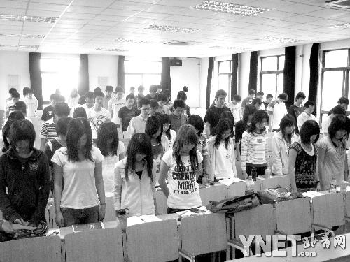教室里、大禮堂、宿舍樓、辦公室、實驗室……昨天下午14點28分,北京各高校凡是有學(xué)生和老師的場所,都成為師生為四川災(zāi)區(qū)死難同胞默哀的地方。清華大學(xué)昨天開通了所有教室的廣播,廣播連通了中央人民廣播電臺。隨著那一聲尖銳而悠長的鳴響劃破天空,清華第一教學(xué)樓101教室正在上課的100多名同學(xué)站起來,共同為災(zāi)區(qū)死難者默哀,主講老師黃成英教授打開了他特意準備的PPT頁面。