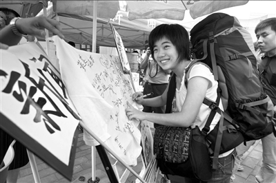 在蔣方舟為自己準備的上學裝備中,一整套自己寫的書成了必備品。“也許以后接受采訪時要用,以防不備吧。”盡管一再說自己對新生活誠惶誠恐,但她顯然要比更多同齡人見過大世面。在新聞系為新生準備的T恤上簽名時,蔣方舟也完全沒有像其他新生那樣羞澀。