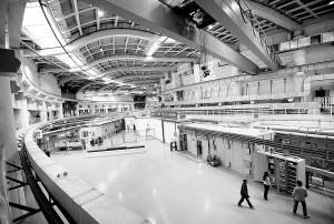 出光的具體過程是這樣的,高壓電從直線加速器扣動“電子槍”,發射出無數個電子。它們在直線隧道內的真空電磁場中疾行,加速至接近光速水平,能量達到150兆電子伏特(150M eV)。接著,這股低能光束線便打彎“注入”內圈小環隧道———增強器,能量在轉圈的瞬間被提升22倍左右,變成35億電子伏特(3.5G eV)的高能光束線,最后“注入”外圈大環隧道———比400米跑道還長的儲存器。高能光束線晝夜不停地高速穿行,并沿著大環不斷“轉圈”,在不同切線方向上“條分縷析”,引出數十束不同波長的形形色色的光,覆蓋從遠紅外線到硬X射線的所有波段,供外圍大廳內成百上千的實驗站科研人員進行多學科研究。