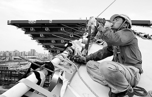 下午兩點,記者帶著溫度計來到世博工地外國館片區,陽光下,水銀柱停留在40攝氏度上。走上5分鐘,汗水濕透了全身。高溫挑戰著每個建設者的意志力。在法國館將要完成的鋼結構屋頂上,幾個工人正在安裝最后的鋼架,為了避免曬傷,他們穿著長袖長褲的工作服,戴著安全帽。從屋頂爬下來時,每個人都像是剛從水里撈上來的。工人老張說,安全帽不能脫,汗水一刻不停地沿著帽子流下來,眼睛都睜不開,得一直用手擦。