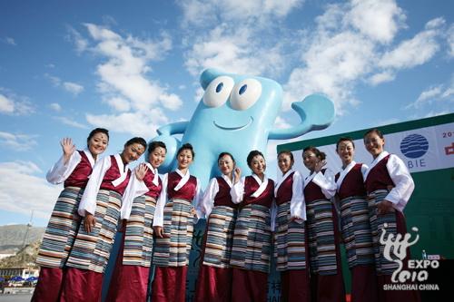 在雄偉壯觀的布達拉宮前,上海世博會的使者“海寶”張開笑臉,歡迎來自四方的游客,開幕活動儀式結(jié)束后,廣場上的民眾爭相與“海寶”留影紀念,他們紛紛表示希望2010年去上海看世博會。