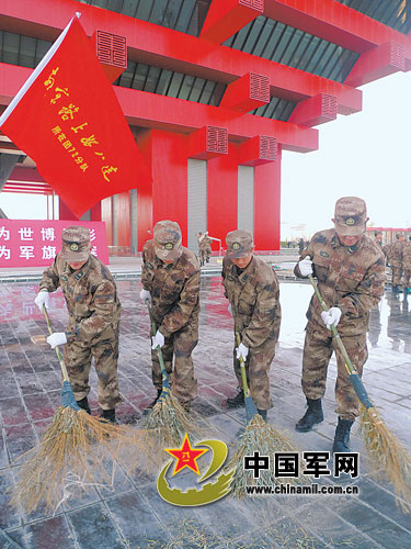 在一塊寫著“為世博添彩,為軍旗增輝”的巨型標語牌前,“南京路上好八連”的官兵拿起掃帚、鍬、鏟子等工具,緊張清理著各種建筑垃圾,他們和身后熱火朝天忙碌施工的建筑工人們一起并肩奮戰,為世博會能圓滿開幕奉獻著自己的力量。