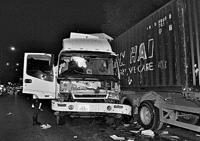 中新網7月9日電 據香港文匯報報道,香港屯門公路8日凌晨發生嚴重車禍。一輛密斗貨車疑在路面左穿右插失事,狂撼前面一輛貨柜車車尾,致擋風玻璃甩脫;前座司機妻子疑沒有佩戴安全帶,如炮彈般從車頭飛出車外,再被密斗貨車卷入車底,左臂被車輪輾壓重傷。