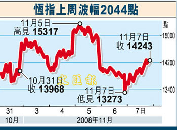 葉尚志估計,港股在10676點見底后的第一波反彈,已在周三完成,當日恒指曾見過15318點,后市料進入反復整固階段,上下范圍在12500至15000點間,未來焦點則會放在將公布的內(nèi)地CPI和PPI數(shù)據(jù),以及本月15日舉行的G20首腦會議。