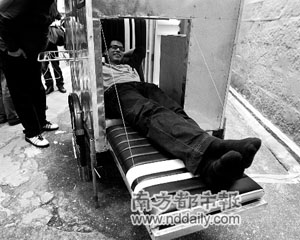 記者在策展人鐘宏亮引領(lǐng)下參觀了整個展覽,發(fā)現(xiàn)了不少充滿新意的作品。在女子監(jiān)獄外的名為《工作/空間/再工作/時間》的作品儼然一棟房子,但全部由一塊塊黑色薄木板拼建成,透過木板間的間隙可以看到建筑里的人在活動,而整個建筑又相當(dāng)結(jié)實(shí),人可以從“樓梯”登上房子的二樓。名為《流浪家居》的作品,作者甚至設(shè)計了一輛“房車”,不過是流浪者的“房車”,由自行車帶動,“房車”麻雀雖小,五臟俱全,里面有窗有門,有柜子有凳子,通過拼接還可以組成一張床,作者現(xiàn)場向大家講解時還興奮地拼起床躺了下來。(馮悅)