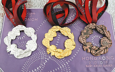 中新網11月6日電 據香港《文匯報》報道,2009年東亞運動會的獎牌5日首次曝光,獎牌以9片葉子圍繞而成,獎牌中心真空。設計師劉小康表示該設計以環保為主題,也打破以往獎牌設計均以突出主辦地特色及文化的慣例,以9個參賽國家和地區的代表樹葉和花瓣拼湊出獎牌,以凸顯參賽運動員的團結一致。