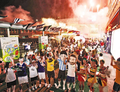 據香港文匯報報道,昨晚8時,南非世界杯正式開幕。適逢周五晚,眾多香港球迷互相邀約外出湊熱鬧看球。中環蘭桂坊多間酒吧食肆都有直播揭幕禮及首日兩場賽事,整條街掛滿世界杯參賽隊伍的國旗,也有衣著性感的啤酒女郎跟球迷、旅客合照,氣氛熱鬧,到晚上10時揭幕戰“開波”時,蘭桂坊已擠得水泄不通,很多酒吧坐滿客人,有球迷不怕熱,索性站在酒吧門口,“遠眺”酒吧內的電視“觀戰”。