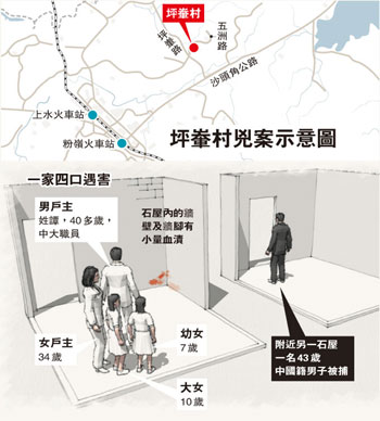 2時許,同事趕到坪輋村譚家時,發(fā)現(xiàn)一名可疑男子在石屋前泥地掘坑有所動作,感覺不妙,于是立即報警。其間疑人發(fā)現(xiàn)行藏敗露,立即跑到附近一間村屋匿藏。警員接報馳至,發(fā)現(xiàn)泥地上有可疑血漬,立即召消防到場協(xié)助,消防員將泥土的表層翻開,見2具男女大人,以及2具女童的尸體,由于4名死者已無生命跡象,警方立即封鎖現(xiàn)場,以待7日進(jìn)一步挖掘調(diào)查。