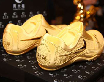 除黃金磚墻外,另一個焦點是劉翔黃金跑鞋,以純金打造的“黃金跑鞋”,其原形來自劉翔在洛桑破紀錄時所穿的跑鞋,長26厘米,以實物原大小一比一打造,黃金重約16兩,約值港幣238000元。制作需時,由于跑鞋的紋理十分多,以及非常復雜,單是制作蠟模已經需時40天,黃金跑鞋總共需時2個月才完成。