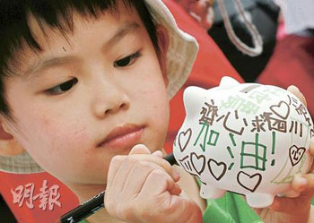 此外,海港城亦舉行慈善義賣(mài),市民捐款50元,即可獲得白瓷錢(qián)罐,畫(huà)上對(duì)災(zāi)民的祝福。而22日起,將發(fā)售印有小朋友畫(huà)作及對(duì)四川災(zāi)民祝福語(yǔ)句的T恤,每件售150元。