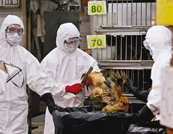 六月十一日,香港食環(huán)署人員穿著保護(hù)袍服到街市圍封活家禽零售點(diǎn)。漁護(hù)署當(dāng)天宣布由于在深水埗等四個(gè)街市的雞只樣本,化驗(yàn)出H5N1病毒呈陽性反應(yīng),因此決定于全港街市屠殺活家禽。漁護(hù)署表示,病毒源頭不排除是走私雞。 中新社發(fā) 譚達(dá)明 攝