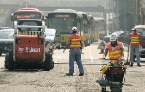 友誼大馬路大規模鋪路工程展開,現場路面有限度通車。(圖片來源:澳門日報)
