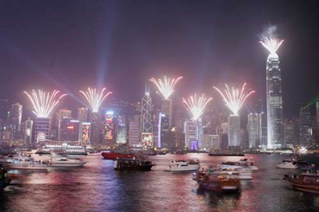 二十三時五十九分,行政長官曾蔭權(quán)在尖沙嘴文化中心啟動倒計時儀式。二00七年的最后二十秒,國金二期北面外墻兩側(cè)由三十二層起依次向上燃放焰火,火樹銀花照耀整個維港;合和中心、AIG大廈、長江集團中心及東企業(yè)廣場四棟大廈,外墻同時顯示倒計時時間,停泊在維港的滅火輪則向海面噴射多樣的水花……