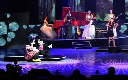 據報道,牡丹峰樂團由金正恩親自組建,他觀看的這次演出包括美國迪士尼系列的歌舞劇。表演者打扮成米老鼠,小熊維尼等迪士尼知名卡通形象在舞臺上進行表演,同時巨大背景屏幕上播放著“白雪公主”、“美女與野獸”等迪士尼電影片段。