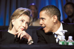 2006年7月19日,奧巴馬與希拉里在華府舉行的一次聯會席間交談甚歡。