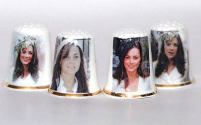 總部設在英國的一家中國頂針制造商的設計人員近日設計出一套以凱特為主題的頂針。每個頂針上都印有凱特的笑臉,而且每個頂針上的圖案都不同:凱特戴著不同款式的帽子。由于圖案有所區別,更增加了這套頂針的收藏價值。目前每套頂針的售價是4.40英鎊。