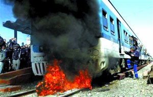 阿根廷電視臺畫面上,布宜諾斯艾利斯西郊梅洛站?康囊涣谢疖嚸爸跓煟鹧嫱虥]整列火車。在鄰近梅洛的卡斯特拉爾站,乘客向售票處投擲石塊,站在鐵軌上阻止列車進站。