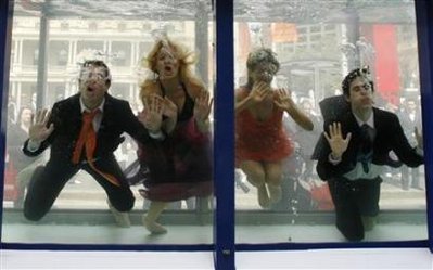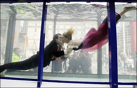 9名穿著時尚的模特,爬上梯子后,縱身跳入位于悉尼環形碼頭的水槽,讓攝影師捕捉鏡頭,同時也取悅路人。