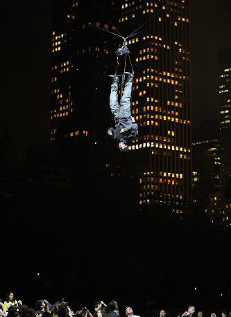 表演結(jié)束之后,戴維布萊恩再送給魔術(shù)迷另一個(gè)表演,他從十三點(diǎn)四公尺高的金屬架頂向下墜落,短暫擺蕩后又急速往上升,接著就消失在公園上方的夜空中。