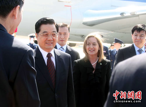 圖為胡錦濤在機場受到美方官員和中國駐美大使館人員的熱烈歡迎。中新社發 張朔 攝