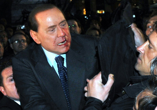 中新網(wǎng)12月14日電 當?shù)貢r間13日,意大利總理貝盧斯科尼在米蘭市中心的米蘭大教堂附近參加一場政治集會,發(fā)表完演講離開時遭到一名中年的男子的襲擊。該男子隔著保鏢向他的右臉方向扔去一件重物,導致其鼻骨輕微骨折,兩顆牙齒斷裂,嘴唇內外也都受傷,需要在醫(yī)院接受24小時觀察,以及為期20天的治療。消息一出,舉世嘩然。