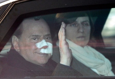 現(xiàn)年73歲的意大利總理貝盧斯科尼13日出席一場政治集會(huì)時(shí),遭攻擊者以石制米蘭大教堂模型丟擊中臉部,鼻梁被打斷,牙齒也掉了兩顆。他臉部和嘴唇被割傷、血流滿面的狼狽鏡頭,短短數(shù)秒之內(nèi)就被媒體播送到全球數(shù)百萬觀眾的眼前。