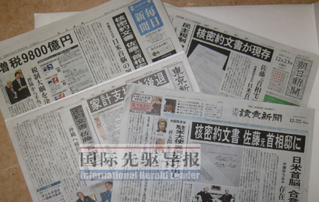 《國際先驅(qū)導(dǎo)報》記者劉華發(fā)自東京 12月22日,日本《讀賣新聞》晚報在頭版頭條刊文稱,一份由美國前總統(tǒng)尼克松和日本前首相佐藤榮作簽署的有關(guān)日美兩國“核密約”的文件,一直保存在日本前首相佐藤榮作的舊宅。