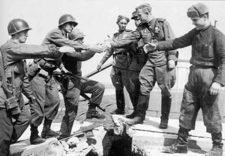 1945年4月25日,一支美軍偵察隊與一隊蘇軍在德國城市托爾高(Torgau)南部易北河畔的一座橋上勝利會師,一幅美蘇兩軍士兵握手的照片從此傳遍世界,成為反法西斯戰爭歐洲戰場出現勝利曙光,希特勒政權即將滅亡的最廣為人知的象征之一。