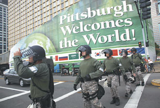 據(jù)當(dāng)?shù)鼐浇榻B,為確保二十國(guó)集團(tuán)金融峰會(huì)的安全,有關(guān)方面部署了將近5000人的警力,其中包括約2500名國(guó)民警衛(wèi)隊(duì)員、1200名州警、870多名匹茲堡市警員以及其他執(zhí)法人員。