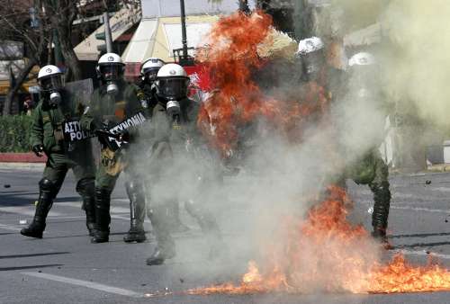 其中在雅典中部有三萬多人示威,于國會大樓外等多處地方,示威者向防暴警察投擲石塊和汽油彈,放火燒車和垃圾桶,又破壞銀行、珠寶店、戲院等10多間商店,警方發射催淚彈和手榴彈驅散人群。