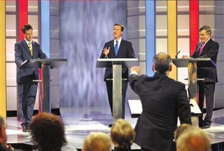在上周以國(guó)內(nèi)政策為主題的電視辯論中,自民黨候選人克萊格的光芒壓過(guò)他的競(jìng)爭(zhēng)對(duì)手,工黨領(lǐng)袖布朗和保守黨黨魁卡梅倫。而他領(lǐng)導(dǎo)的政黨在辯論后的民意調(diào)查中從最末躍居第一。