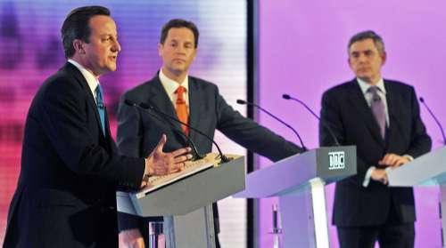 工黨領(lǐng)袖布朗、保守黨領(lǐng)袖卡梅倫和自由民主黨領(lǐng)袖克萊格分別就削減財(cái)政赤字、減少稅收、銀行監(jiān)管和英國(guó)制造業(yè)等一系列問(wèn)題交鋒。