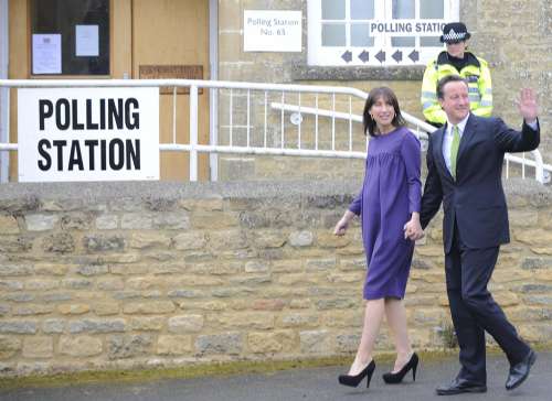 在牛津郡,保守黨領導人卡梅倫與夫人薩曼莎離開投票站。