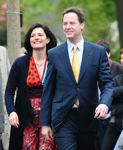 英國第三大黨自由民主黨領導人克萊格與夫人米在謝菲爾德住所附近參加投票。