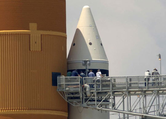 圖為15日,工作人員對(duì)“奮進(jìn)”號(hào)航天飛機(jī)進(jìn)行維修。