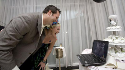 眼看婚禮要泡湯,兩人靈機一動,決定通過網絡向倫敦的親友們直播婚禮儀式。機場酒店人員獲悉后不但借給他們安裝了Skype聊天工具的電腦,而且還將酒店進行了一番裝飾布置,并定做了一個三層結婚蛋糕。