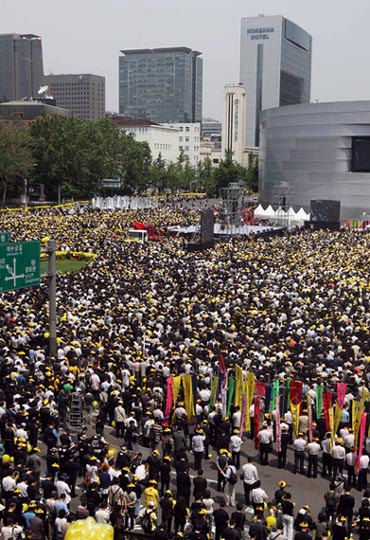 警方估算,首爾廣場(chǎng)一帶云集了18萬(wàn)名追悼者。大多數(shù)市民頭戴象征故人的黃色太陽(yáng)帽,并手持黃色氣球追悼盧武鉉。