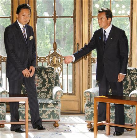 14日下午,麻生太郎和鳩山由紀夫在國會議事堂內進行了會談。會談持續了大約20分鐘,鳩山向麻生協助政權順利交接一事表示感謝,表示希望麻生“給一些知道和建議”。由于上任后將出席在紐約聯合國總部舉行的聯大會議以及在美國匹茲堡舉行的二十國集團金融峰會,鳩山向麻生詢問了有關外交事務、G20峰會等方面的建議。