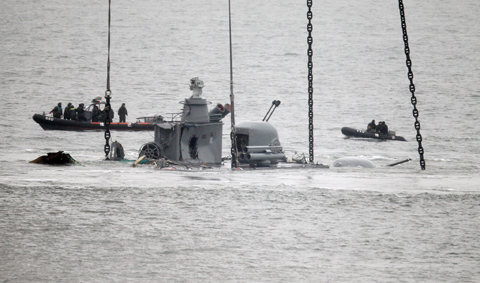 海軍方面的一位有關負責人表示:“風浪很大,再加上出現‘漲潮’現象,水流速度非常快,因此周末之前很難完成打撈作業。”負責打撈作業的民間企業的一位有關負責人表示:“如果現在繼續進行打撈作業,鐵鏈可能會破入船體的脆弱部分。能承受鐵鏈力量的船體耐用材料已經流失。”