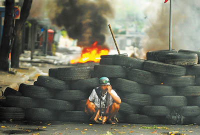 13日,為了逼迫占據(jù)曼谷繁華商業(yè)區(qū)已近兩個(gè)月的“紅衫軍”撤離,泰國(guó)政府切斷了該商業(yè)區(qū)的水電供應(yīng),“紅衫軍”隨即與軍警發(fā)生沖突。16日,“紅衫軍”點(diǎn)燃了作為路障的汽車輪胎,一股股濃煙騰空而起。此外,他們還把警察設(shè)立的交通檢查站潑上汽油并放火焚燒。