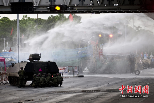 5月19日,泰國軍隊開進紅衫軍集會區域,展開“清場”行動。行動導致5人死亡,多人受傷。當天下午,7名紅衫軍領導人集體自首,并宣布結束集會示威。