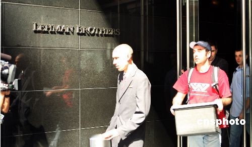 9月15日,美國有著158年歷史的第4大投資銀行雷曼兄弟公司于向法院申請破產(chǎn)保護,員工當(dāng)日從雷曼兄弟公司位于紐約的總部大樓內(nèi)將清理的辦公用品搬離公司。中新社發(fā) 鄧悅 攝