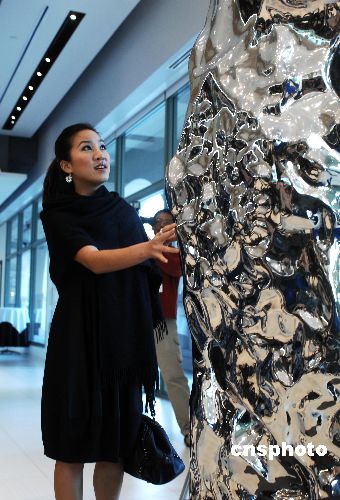 圖為關(guān)穎珊欣賞中國(guó)藝術(shù)家展望的不銹鋼雕塑《假山石》。