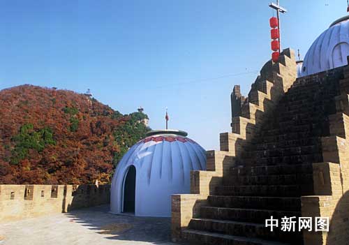 傍晚時(shí)分,一串串號(hào)燈彤紅高懸,帥旗、戰(zhàn)旗、旌旗獵獵。偶爾傳來(lái)幾聲戰(zhàn)馬嘶鳴和幾聲清脆的巡營(yíng)梆鼓。龍頭寺吊橋門,一夫當(dāng)關(guān),萬(wàn)夫莫開(kāi),李世民的千軍萬(wàn)馬當(dāng)年均由此入營(yíng),森嚴(yán)壁壘,固若金湯。唐營(yíng)觀夕照:當(dāng)日落西山時(shí),一輪紅日紅艷欲滴,舉手可攬。在此拍照留影,如雙手捧日。落日的余暉里,火燒云天邊斜掛,蒼山如海,殘陽(yáng)如血,真是神靈造化,天下奇觀。