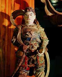 這里中央坐九頭青獅的為“太一救苦天尊”,兩側為五方接引童子。傳說救苦天尊,千處有求千處應,尋聲趕來,救苦救難,所以又稱“尋聲救苦天尊”。他有放百億瑞光,照亮幽冥地獄,拔度地獄亡靈,使他們解脫罪孽投生轉世的法力。右側墻壁上有救苦天尊施展法力,救助苦海遇難眾生的畫面。左側為救苦天尊化身救助病人的情景。五方童子手執“五色寶幡”,意為接引五方世界一切有緣眾生。