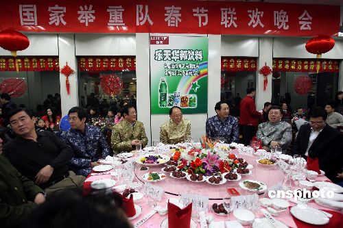 國家體育總局局長劉鵬(中),舉摔柔中心主任馬文廣和國家舉重隊隊員一起歡度除夕之夜。