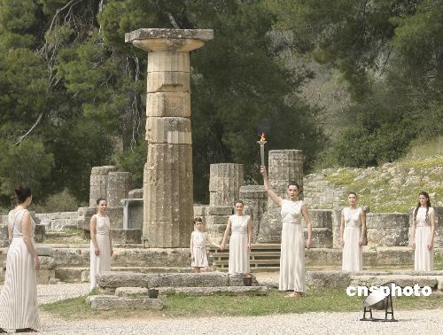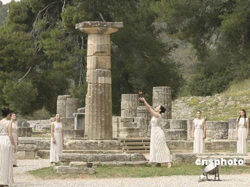 當?shù)貢r間3月23日,北京奧運圣火采集最后一次彩排在希臘古奧林匹亞遺址舉行,最高女祭司瑪利亞·娜芙普利都高舉已經(jīng)引燃的火炬。中新社發(fā) 王歡 攝