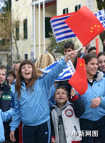 3月25日,北京2008年奧運圣火希臘傳遞第二天,慶典儀式在終點約阿尼納舉行。市民高舉中國和希臘國旗歡迎北京奧運圣火到來。中新社記者 王歡